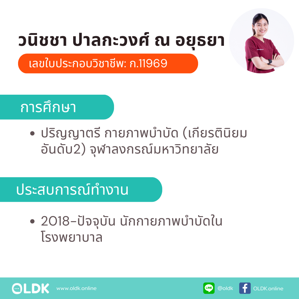 บริการกายภาพบำบัดที่บ้าน โดย กภ.วนิชชา ปาลกะวงศ์ ณ อยุธยา (เลขใบประกอบวิชาชีพ: ก.11969)