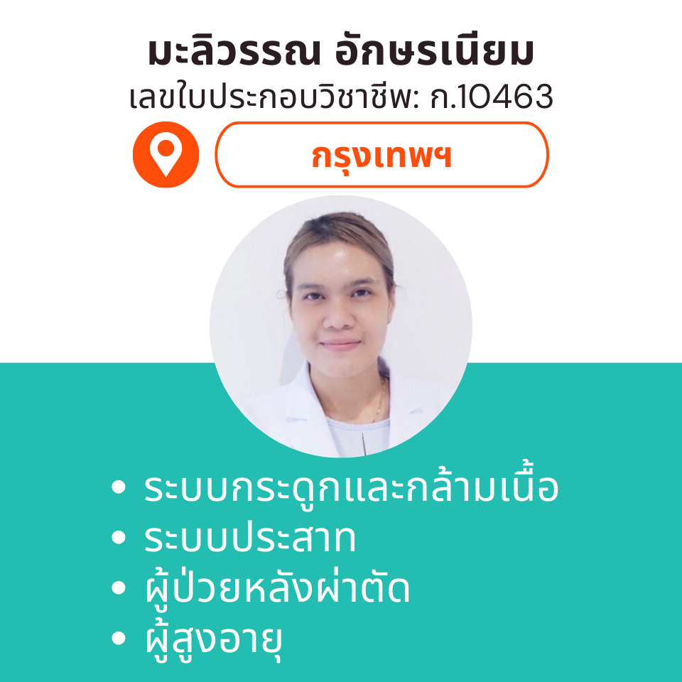 บริการกายภาพบำบัดที่บ้าน โดย กภ.มะลิวรรณ อักษรเนียม (เลขใบประกอบวิชาชีพ : ก.10463)