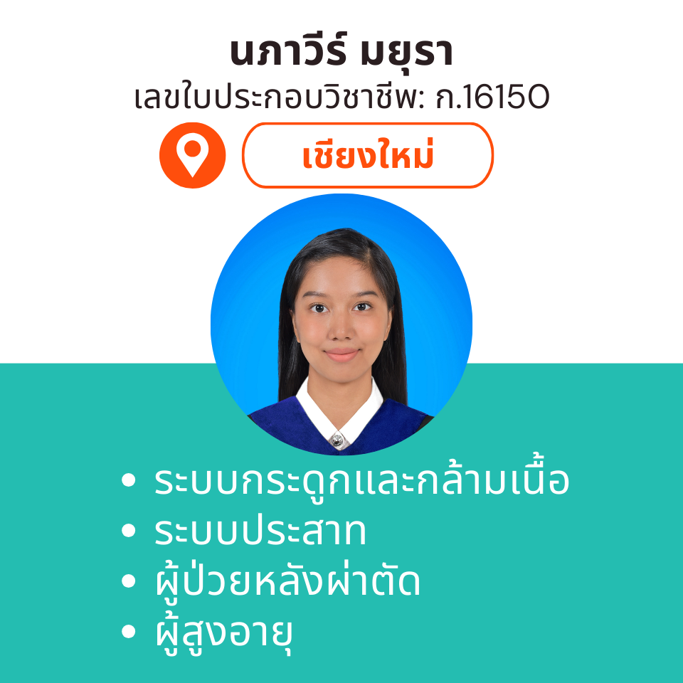 บริการกายภาพบำบัดที่บ้าน โดย กภ.นภาวีร์ มยุรา (เลขใบประกอบวิชาชีพ: ก.16150)