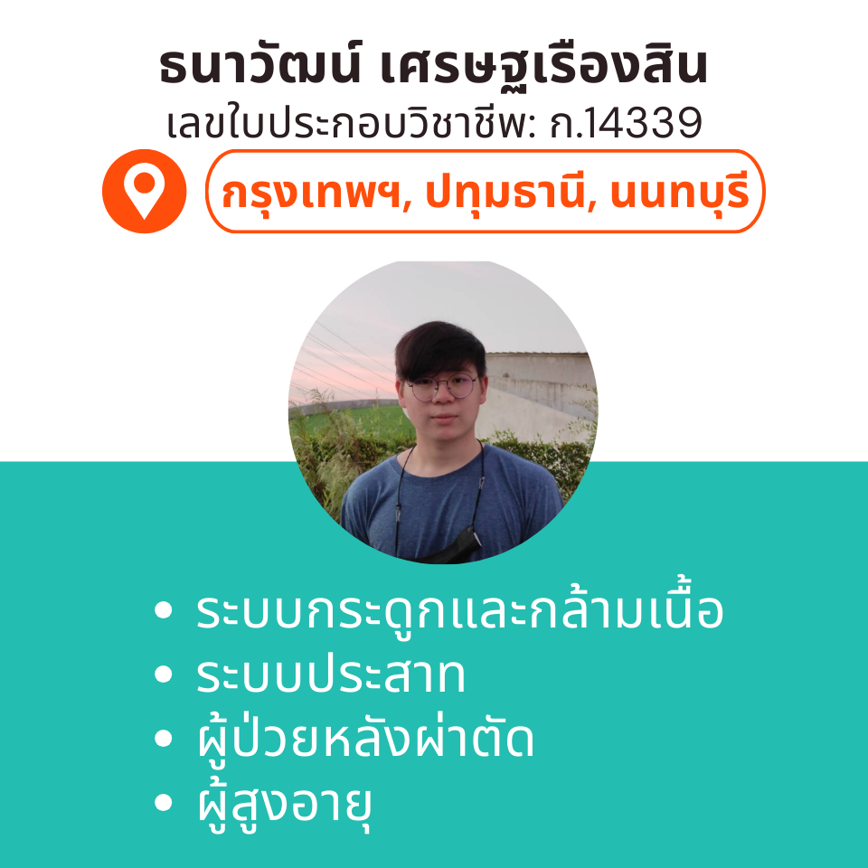 บริการกายภาพบำบัดที่บ้าน โดย กภ.ธนาวัฒน์ เศรษฐเรืองสิน (เลขใบประกอบวิชาชีพ: ก.14339)